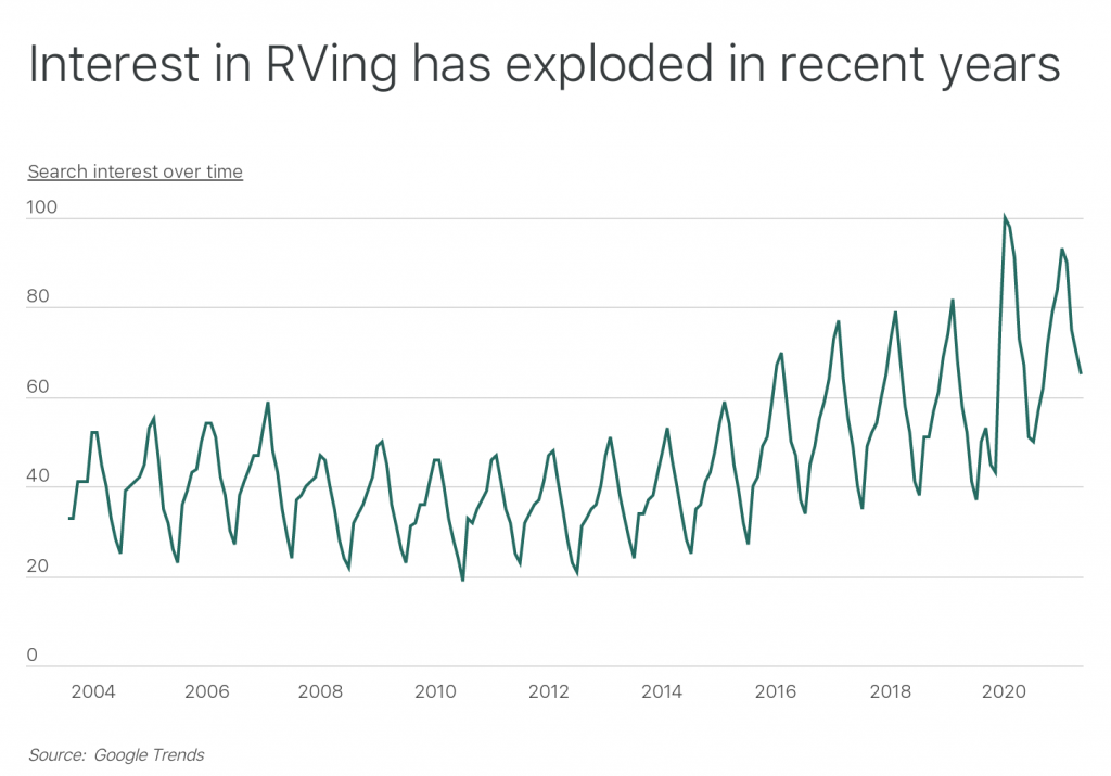 While the pandemic has certainly increased the appeal of camping and outdoor recreation in the last 18 months, Google Trends data confirms that interest has in fact been growing rapidly for longer than that. Overall search interest in RVing was flat or on a slight decline for most of the 2000s and early 2010s. In more recent years, interest has grown rapidly, reaching an all-time high in 2020. Now, search interest in RVing during off months is comparable to peak season search interest from a decade ago.